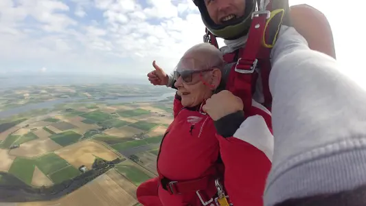 Waaghals Lizy maakt haar grote droom waar met een gewaagde duo-sprong uit het vliegtuig.