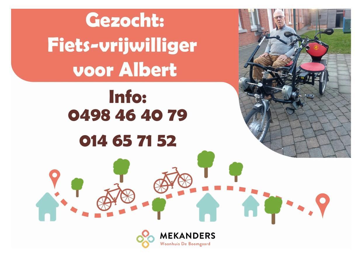 Heb jij tijd en goesting om samen met Albert een fietstochtje te maken? Voor wat meer info of een kennismakingsgesprek kan je bellen naar woonhuis De Boomgaard (014 65 71 52, Vooreel 36 in 2380 Ravels-Eel) of naar zijn persoonlijke begeleider Johan (0498 46 40 79).
