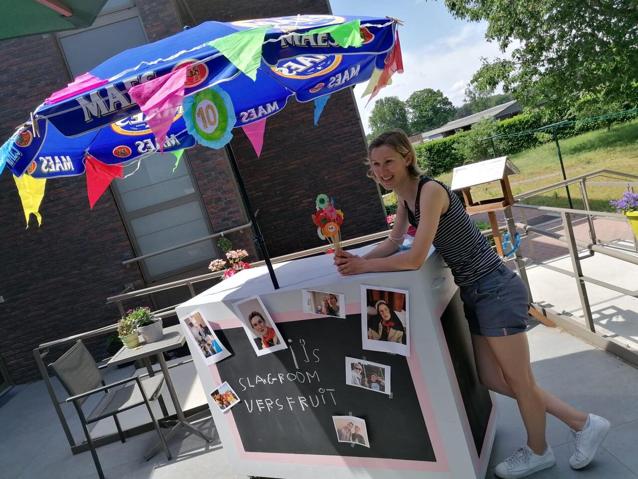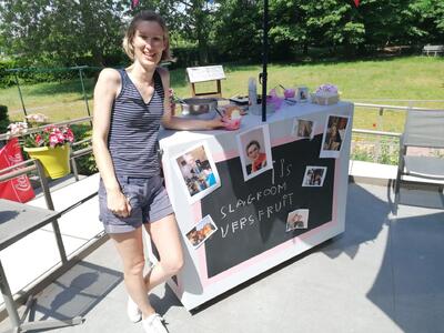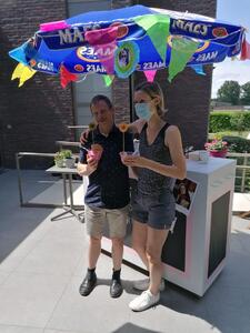 Iedereen mocht aanschuiven aan de mooi versierde ijskar. Dat ijsje met vers fruit viel bij iedereen in de smaak bij deze zomerse temperaturen.