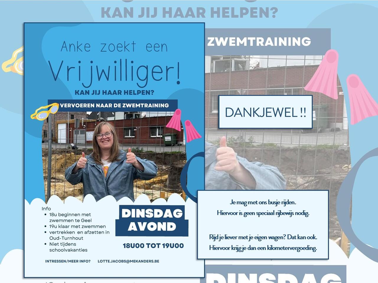 Anke gaat naar de zwemtraining in Geel op dinsdagavond. Zij zoekt een chauffeur die haar van het woonhuis in Oud-Turnhout kan vervoeren naar het zwembad in Geel en haar na de zwemtraining ook weer kan terugbrengen.